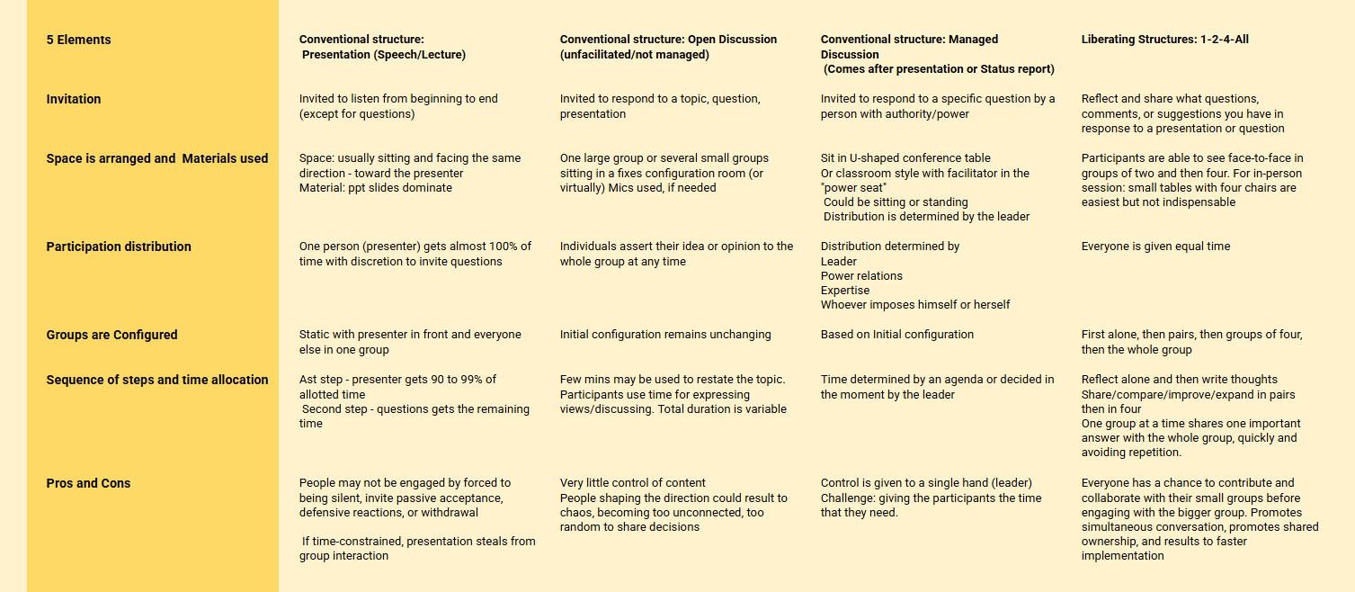 Liberating Structures are simple methods designed to improve performance by including and engaging everyone. The secret is to stop talking about changing and just do it. Start small and slowly scale through the methods. They work by subtly shifting control of the content to all participants, fostering collaboration in organizing, problem-solving, and decision-making.